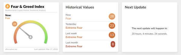 L'indice de peur et d'avidité est passé de la zone de peur extrême à la zone de peur, passant de 23 à 28 points.