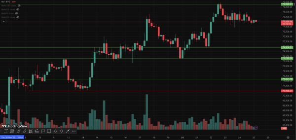 Niveaux clés : support – environ 75 000 $ ; résistance – 80 000 $ (seuil de rentabilité pour les détenteurs à court terme).