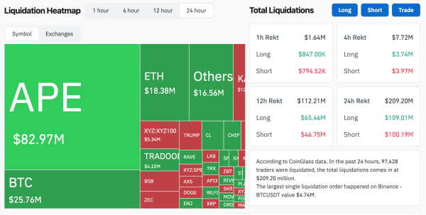 Au cours des dernières 24 heures, 97 501 positions de traders ont été clôturées de force. Le volume total de liquidation s'élève à 209,27 millions de dollars.