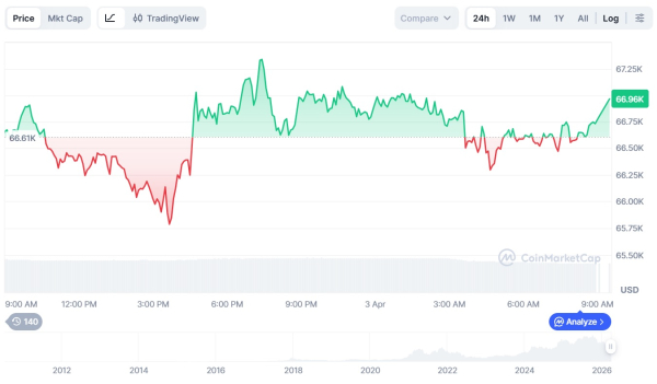 L'actif se négocie entre 65 788 $ et 67 342 $. La baisse depuis le sommet local a été régulière mais assurée, ce qui est typique des principaux acteurs ajustant leurs positions avant le week-end.