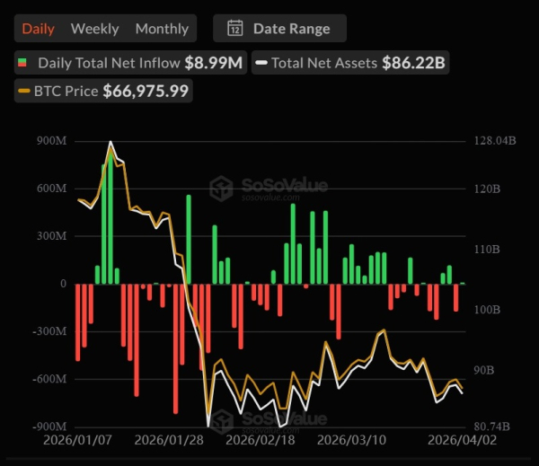 Après des sorties de capitaux de 173,73 millions de dollars, les ETF Bitcoin au comptant ont enregistré une entrée nette de 8,99 millions de dollars, selon SoSoValue.