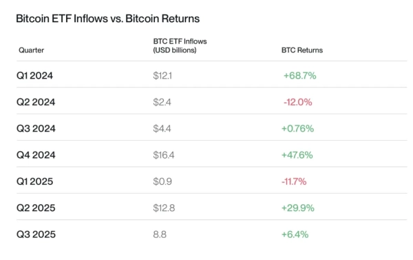 Selon le DSI de Bitwise, la flambée du prix du Bitcoin génère également de nouveaux flux de capitaux vers les ETF. Chaque trimestre où le Bitcoin a généré des rendements à deux chiffres, des milliards de dollars ont été investis dans des ETF basés sur cet actif.