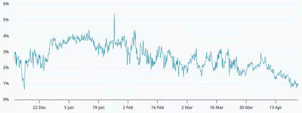 La prime annuelle des contrats à terme sur l'ETH par rapport au marché au comptant a chuté à 1 % , un niveau nettement inférieur au seuil de neutralité de 4 % . Cependant, cela ne signifie pas nécessairement que les principaux acteurs anticipent une baisse. L'incertitude générale pèse sur le marché, notamment en raison des résultats décevants des entreprises technologiques.