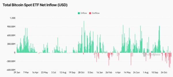 « Après des mois d’afflux réguliers, les sorties de capitaux témoignent d’une prudence croissante, le Bitcoin ayant chuté d’environ 22 % au cours du mois écoulé et de 7 % sur un an », a écrit Walter Bloomberg.