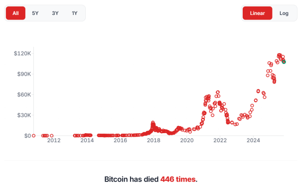 Au fil du temps, les articles annonçant la « mort » des cryptomonnaies sont devenus un phénomène viral. Un site web recense le nombre de fois où des journalistes ont prédit la disparition certaine du Bitcoin. Au 3 novembre 2025, le Bitcoin était déjà « mort » 446 fois.