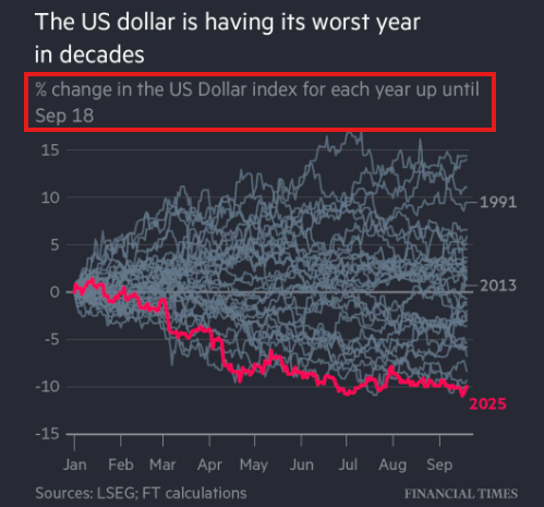 Le dollar américain connaît sa pire année depuis 1973. Selon The Kobeissi Letter, l'indice du dollar (DXY) a chuté de 10,8 % au premier semestre 2025. Il s'agit de la plus forte baisse depuis l'effondrement du système de Bretton Woods et l'abandon de l'étalon-or par les États-Unis.