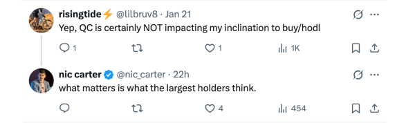 L'opinion de Carter sur l'informatique quantique est loin d'être partagée par tous. Vajay Boyapati, fervent défenseur du Bitcoin, a répondu à Carter en affirmant que le sujet mérite clairement d'être discuté et approfondi techniquement, et qu'à cet égard, il partage son avis. Il a toutefois souligné qu'il reste « extrêmement sceptique quant à l'explication des fluctuations du prix du BTC par l'informatique quantique, malgré la présence de certaines notes d'investissement qui ont pu adhérer à cette thèse ».