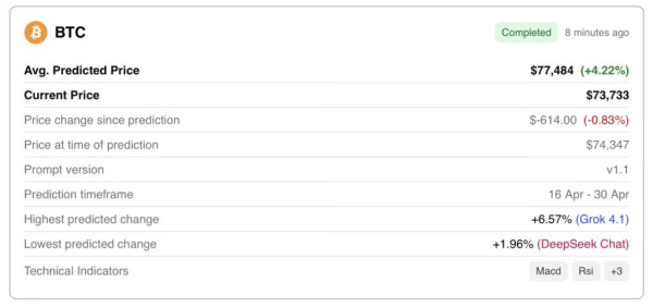Plus précisément, un agent de prévision basé sur l'IA, qui a combiné des données provenant de ChatGPT, Grok, Gemini et DeepSeek, a calculé que le prix moyen du $BTC le 30 avril était de 77 484 $, ce qui implique une augmentation de 4,1 % par rapport au prix actuel de 74 400 $.