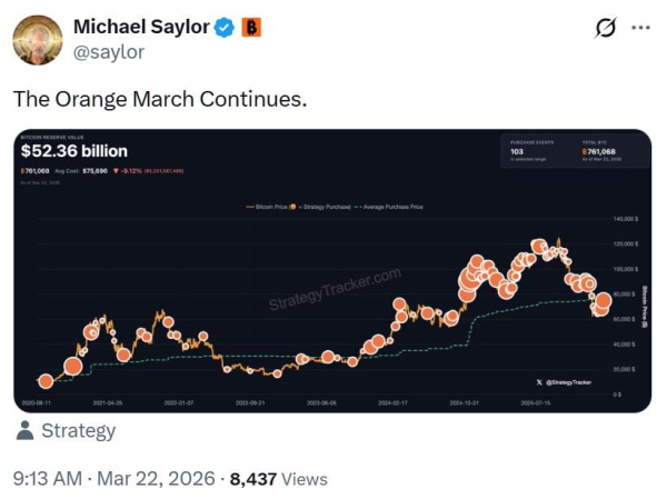 « La progression fulgurante se poursuit », a écrit Saylor. Ce message faisait suite à une série de signaux récents, dont un graphique précédent intitulé « Étirer les points orange », qui mettait en évidence l'accumulation continue de Bitcoins par Strategy et est apparu juste avant l'annonce d'un achat de 22 337 $ en BTC , augmentant ainsi considérablement ses avoirs. Le graphique le plus récent montrait que les avoirs en Bitcoins de Strategy au 22 mars 2026 s'élevaient à 52,36 milliards de dollars, avec un total de 761 068 BTC et un coût d'acquisition moyen de 75 696 $ par Bitcoin.