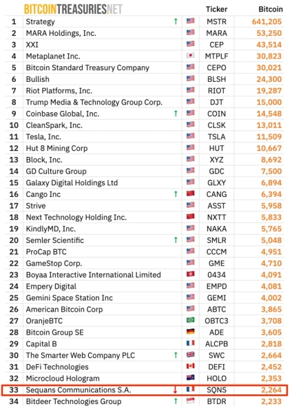 Sequans est passé de la 29e à la 33e place du classement des plus grands détenteurs d'or numérique.