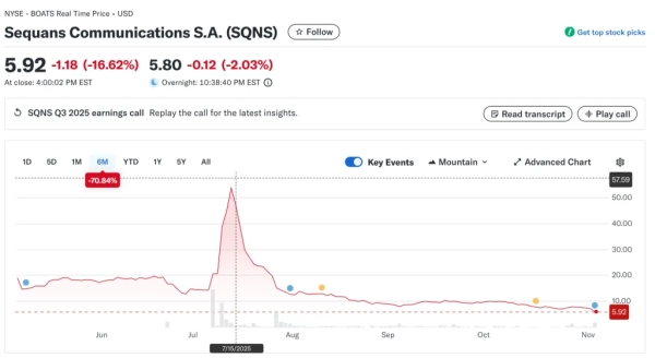 Sequans a commencé à lever des fonds en cryptomonnaie en juin, pour un montant de 385 millions de dollars, grâce à des émissions d'obligations et d'actions. Depuis, le cours de l'action a chuté de près de 60 %, pour atteindre 5,90 dollars.