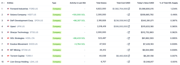 Actuellement, 10 entreprises accumulent du Solana. Elles ont accumulé 2,8 % de l'offre totale de cryptomonnaie, soit 15 998 SOL, d'une valeur de 2,5 milliards de dollars.
