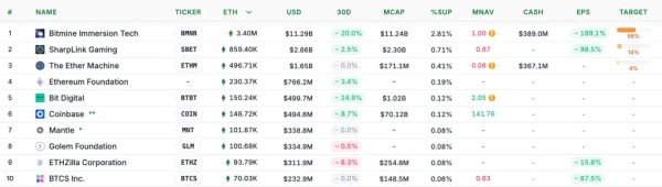 BitMine demeure le principal détenteur, avec 3,4 millions d'ETH, soit 11,2 milliards de dollars. Son actif net capitalisé (mNAV) est de 1. En juillet, il avait atteint 5,6.