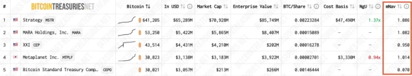 La valeur liquidative médiane (mNAV) de Sequans a chuté de son pic de 20,45 en juillet à 0,6 actuellement, selon Bitcoin Treasuries. Les valeurs des principaux détenteurs de Bitcoin sont également faibles.