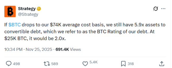 Dans son communiqué, la société a indiqué que même si le Bitcoin chutait à son prix d'achat moyen de 74 000 $, elle conservait un ratio de couverture de ses actifs de 5,9 fois sa dette convertible. Autrement dit, selon Strategy, la valeur de ses actifs est environ six fois supérieure au montant de la dette qui pourrait être convertie en actions à l'avenir.