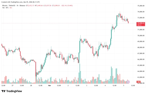 Au moment de la rédaction de cet article, le Bitcoin se négocie aux alentours de 72 090 dollars, en hausse de 6 % au cours des dernières 24 heures.