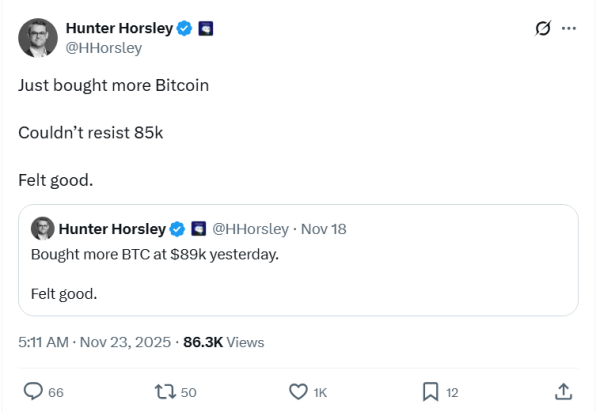 Le PDG de Bitwise, Hunter Horsley, a quant à lui déclaré à X qu'il avait « acheté encore plus de BTC ». Il a ajouté qu'il n'avait pas pu résister au prix de 85 000 $ et que « c'était agréable ».