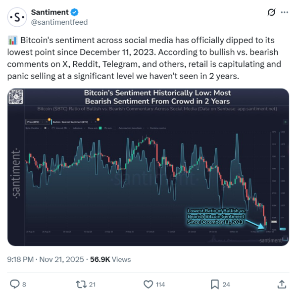 Le sentiment concernant le Bitcoin sur les réseaux sociaux a atteint son niveau le plus bas depuis le 11 décembre 2023. Santiment a analysé les commentaires haussiers et baissiers des acteurs du marché sur X, Reddit, Telegram et d'autres plateformes.