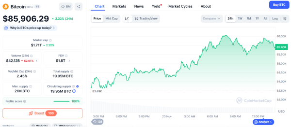 Le 23 novembre, le Bitcoin (BTC) a testé des niveaux supérieurs à 86 000 $. Son pic journalier a atteint 86 547 $. Au moment de la rédaction de cet article, la cryptomonnaie s'était redressée à 85 843 $.