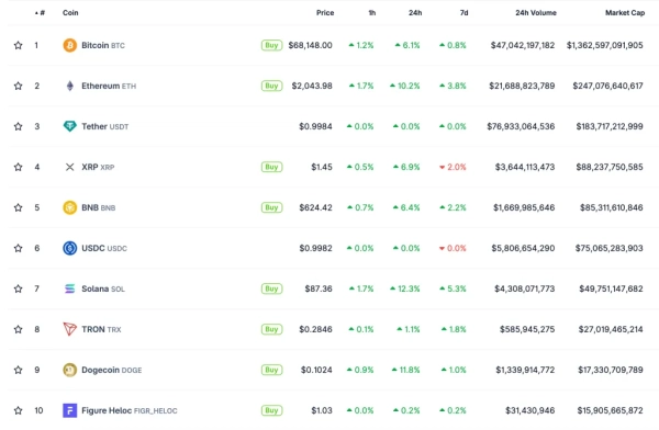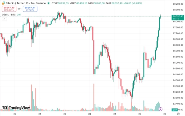 Au cours des dernières 24 heures, le prix de la principale cryptomonnaie a augmenté de 6 %. Au moment de la rédaction de cet article, elle s'échange autour de 68 400 $.