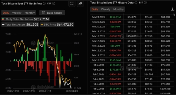 Le regain d'intérêt des investisseurs américains est confirmé par les données relatives aux ETF Bitcoin. Au 24 février, ces instruments avaient attiré plus de 257 millions de dollars, soit le niveau le plus élevé depuis début février.