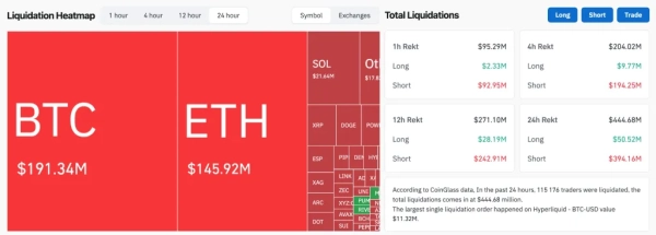Les liquidations ont atteint 444 millions de dollars en 24 heures. La plupart des liquidations forcées concernaient des positions courtes, pour un montant de 50 millions de dollars.
