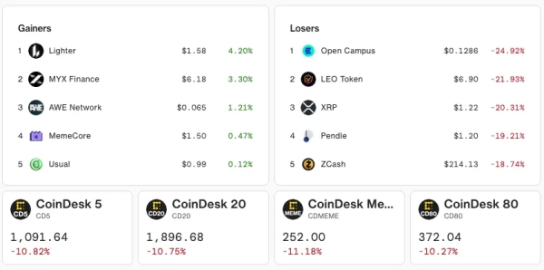 Presque tous les jetons inclus dans l'indice CoinDesk (y compris les jetons majeurs et les memecoins) ont perdu plus de 10 % de leur valeur au cours des dernières 24 heures.