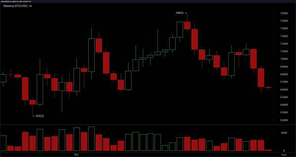 L'évolution quotidienne du cours du Bitcoin a confirmé une tendance baissière plus générale après avoir atteint un plus bas proche de 76 000 $. La zone actuelle autour de 66 000 $–67 000 $ a offert un soutien temporaire, mais l'incapacité à reconquérir les niveaux supérieurs souligne la faiblesse persistante du Bitcoin.