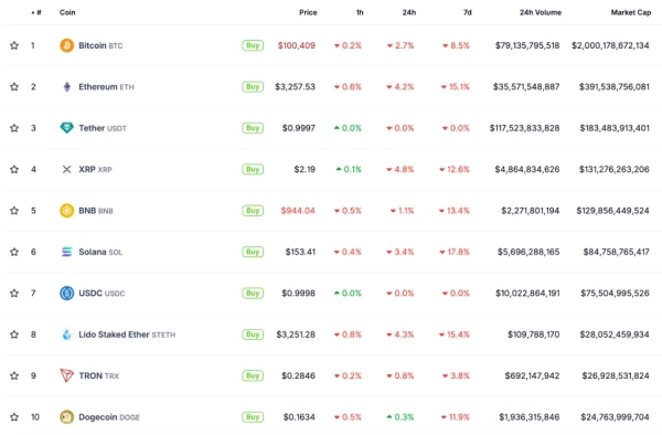 Le Bitcoin a chuté de 2,9 % au cours des dernières 24 heures et de 8,9 % sur la semaine écoulée. À l'heure où nous écrivons ces lignes, il s'échange à 100 110 $.