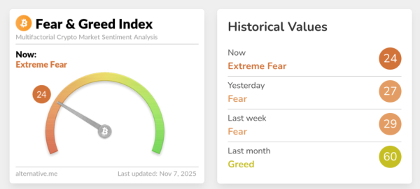 L'indice de peur et d'avidité des cryptomonnaies est à 24, dans la zone de « peur extrême ».