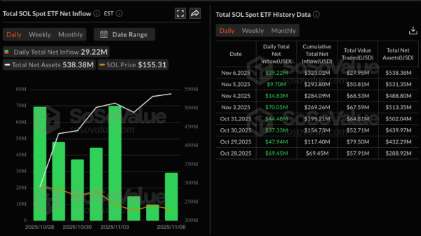 Les ETF Spot Solana ont enregistré des entrées de capitaux pour le huitième jour consécutif, atteignant 29 millions de dollars lors de la dernière séance. Depuis leur lancement, ces instruments ont attiré un total de 323 millions de dollars.