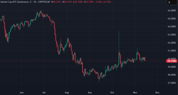 Au milieu de cette correction, la domination du Bitcoin sur le marché a d'abord augmenté, atteignant environ 60,2 %. Cependant, dans la matinée, elle était retombée à 59,7 %.