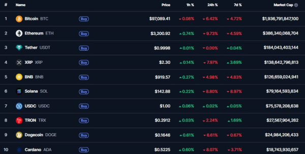 Les 10 principales cryptomonnaies par capitalisation boursière. Source : CoinMarketCap.