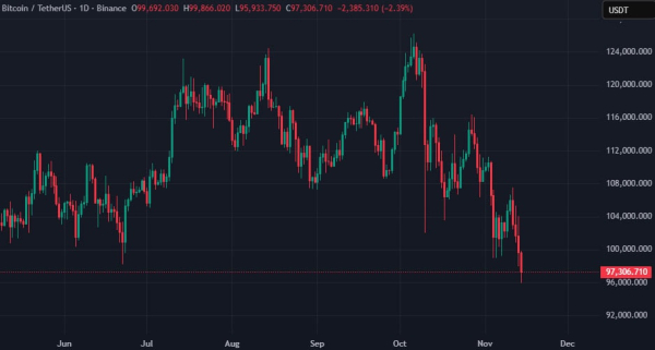 Dans la nuit du 14 novembre 2025, le prix du Bitcoin est brièvement tombé sous la barre des 96 000 $. Il s’agissait de son niveau le plus bas depuis mai 2025. Le prix de la principale cryptomonnaie s’est ensuite redressé pour atteindre 97 000 $.