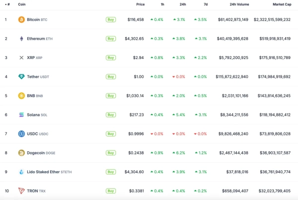 Au cours des dernières 24 heures, la capitalisation boursière du secteur des actifs numériques a augmenté de 3,2 % pour atteindre 4 090 milliards de dollars. Les 10 premières cryptomonnaies par capitalisation boursière ont toutes affiché une dynamique haussière.