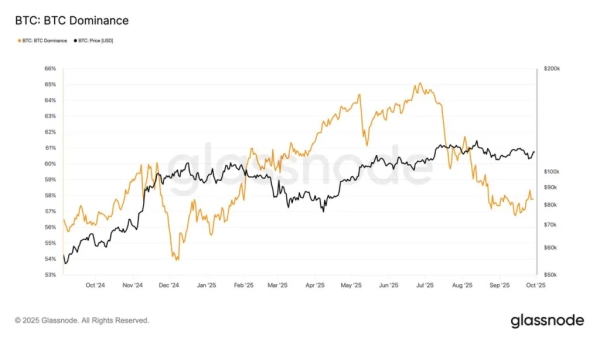 Au moment de la rédaction de cet article, le Bitcoin s'échange autour de 116 400 $. Selon Glassnode, la domination de la principale cryptomonnaie est passée de 57 % à 59 %.