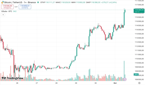Le 30 septembre, le gouvernement américain a suspendu ses opérations pour la première fois depuis 2018. Bitcoin, la principale crypto-monnaie, a augmenté de 3,2 %, franchissant la barre des 116 000 dollars.