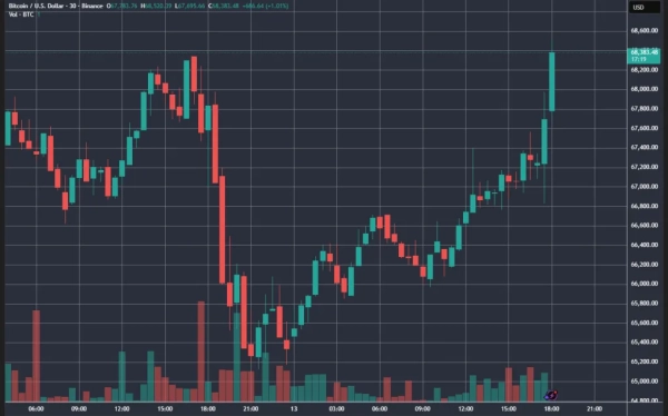 Suite au communiqué de presse du BLS, les prix du Bitcoin ont commencé à augmenter, passant d'environ 67 300 $ à environ 68 500 $.