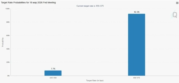 Les marchés des swaps et des options affichent une confiance quasi totale quant au maintien par la Réserve fédérale de sa fourchette de taux directeurs actuelle, comprise entre 3,5 % et 3,75 %, après sa réunion du 18 mars. La probabilité de ce scénario est estimée à 92,3 %. Au cours des dernières 24 heures, le taux a progressé de 0,7 % et de 10,7 % sur le mois écoulé.