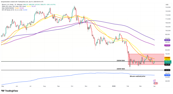 Ci-dessous, les niveaux clés restent la moyenne mobile exponentielle (EMA) à 200 semaines à 68 300 $ et la moyenne mobile simple (SMA) à 200 semaines autour de 59 400 $ .