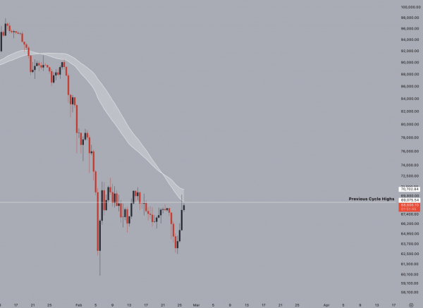 Selon Bitstamp, le Bitcoin est retombé à 67 488 $ le 26 février, en baisse de 1 % sur la journée. La veille, il avait atteint 70 040 $, tentant de reconquérir deux niveaux clés : la moyenne mobile exponentielle (MME) à 200 semaines et son ancien record historique de 2021. Ces deux tentatives ont échoué.