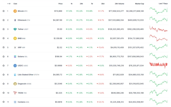 Au moment de la rédaction de cet article, le Bitcoin s'échange autour de 113 600 $. L'Ethereum a presque atteint les 4 100 $ (en hausse de 2,7 % sur la journée).
