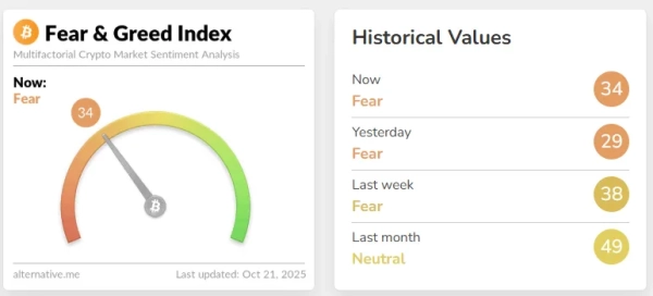 L'indice de peur et de cupidité des cryptomonnaies est passé de 29 points hier à 34 points.