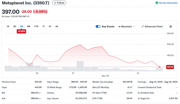 Selon Yahoo Finance, le cours de l'action de Metaplanet a chuté de plus de 27 % au cours du mois dernier et de plus de 6,5 % au cours des cinq derniers jours.