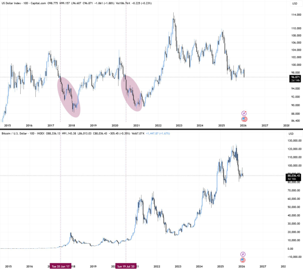 Un utilisateur surnommé BitBull, quant à lui, considère la baisse de la force du dollar américain comme un signal indiquant que le BTC /USD devrait former un minimum à long terme.