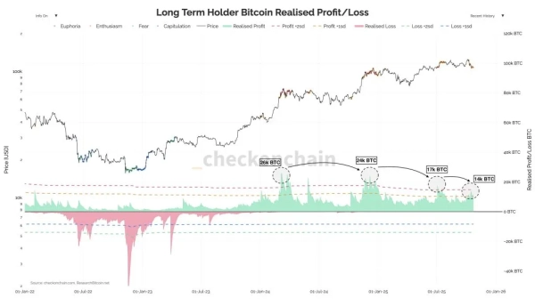 « Après avoir atteint un pic de 14 000 BTC en bénéfices réalisés, les détenteurs à long terme détiennent encore aujourd'hui environ 12 000 BTC, ce qui reste à un niveau élevé. »
