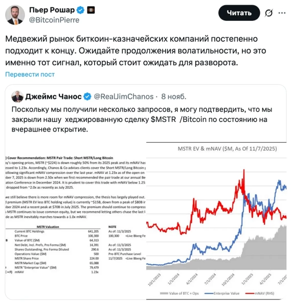 Chanos a ajouté que la prime implicite de MSTR, soit la différence entre sa valeur et la valeur de ses 641 205 BTC détenus, est passée d'environ 70 milliards de dollars en juillet à 15 milliards de dollars. Cela suggère que la société est désormais plus justement valorisée. Bien que MSTR puisse subir une nouvelle compression de sa valeur liquidative, notamment en cas d'émission de nouvelles actions ordinaires, Chanos estime que l'objectif principal de l'opération a déjà été atteint. Roshar a interprété cela comme un signe d'inversion de tendance.