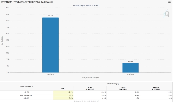 La reprise du Bitcoin a fait suite à une forte hausse des anticipations d'une baisse des taux d'intérêt lors de la réunion de la Réserve fédérale américaine du 10 décembre, la probabilité d'une telle baisse ayant augmenté de 46 % en une semaine.