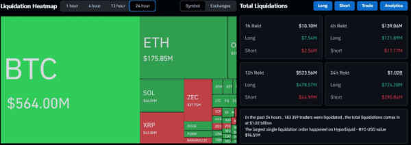 Face à la chute des prix, le marché des contrats à terme sur cryptomonnaies a connu une forte augmentation des liquidations. Selon CoinGlass, le volume total des fermetures de positions forcées au cours des dernières 24 heures a dépassé le milliard de dollars. Plus de 183 000 traders ont été touchés par ces liquidations, la majorité d'entre eux ayant perdu des fonds sur leurs positions longues. Plus précisément :