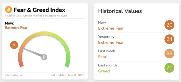 Cette situation survient dans un contexte de forte baisse du moral sur le marché des cryptomonnaies : l’indice de peur et d’avidité, qui reflète le sentiment général du marché, affichait une valeur de « peur extrême » de 20 dans sa mise à jour de samedi.